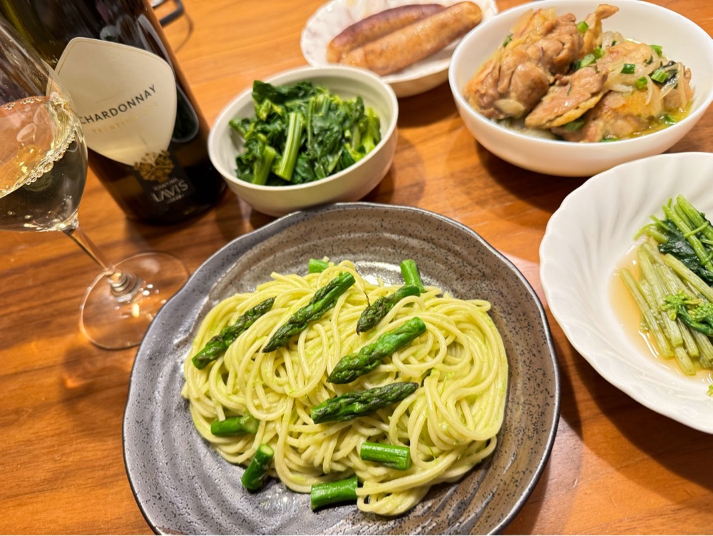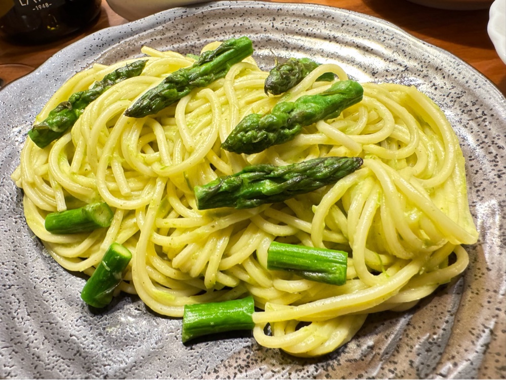 アスパラガスとチーズでソースを作って、パスタに和えてます。