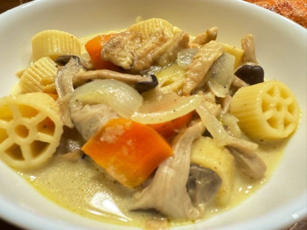 鶏皮と野菜のクリームスープはパスタ入り。