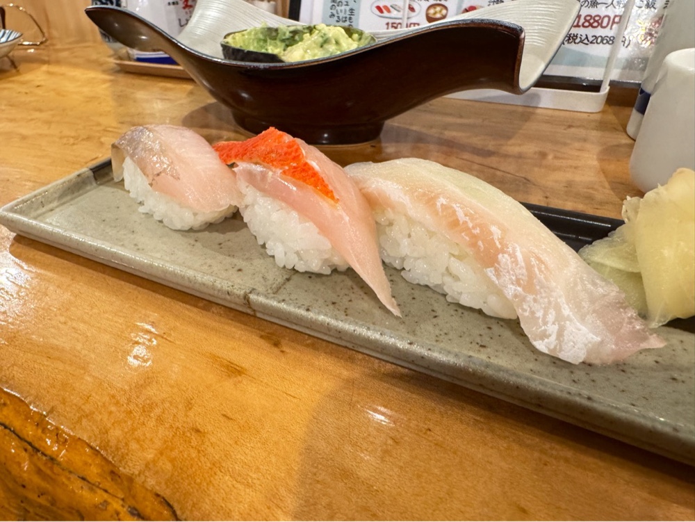 白身の握りは、ホウボウに金目鯛と真鯛。