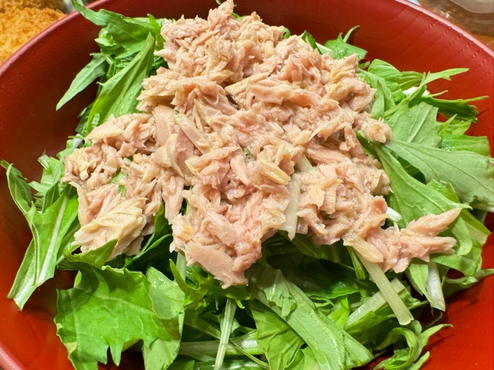 レタスに赤キャベツを足すだけで何時もと違う食感です。