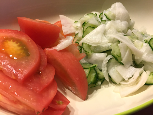 例年、夏は野菜を食べる量が不足して不調になるので、今夜も意識して出してもらいました。蕪とキュウリを買っておいて良かったですね。