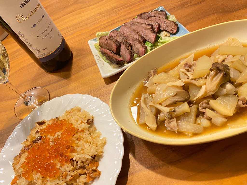 「はらこ飯」と芋煮みたいな野菜スープ、ももにくのステーキ