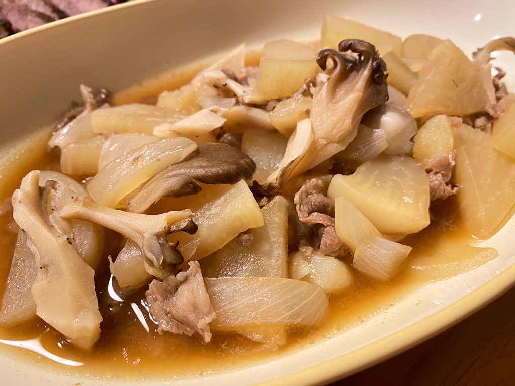 芋煮みたいな野菜スープはヤーコン、大根、ジャガイモ、玉葱、舞茸に仙台牛細切れ。