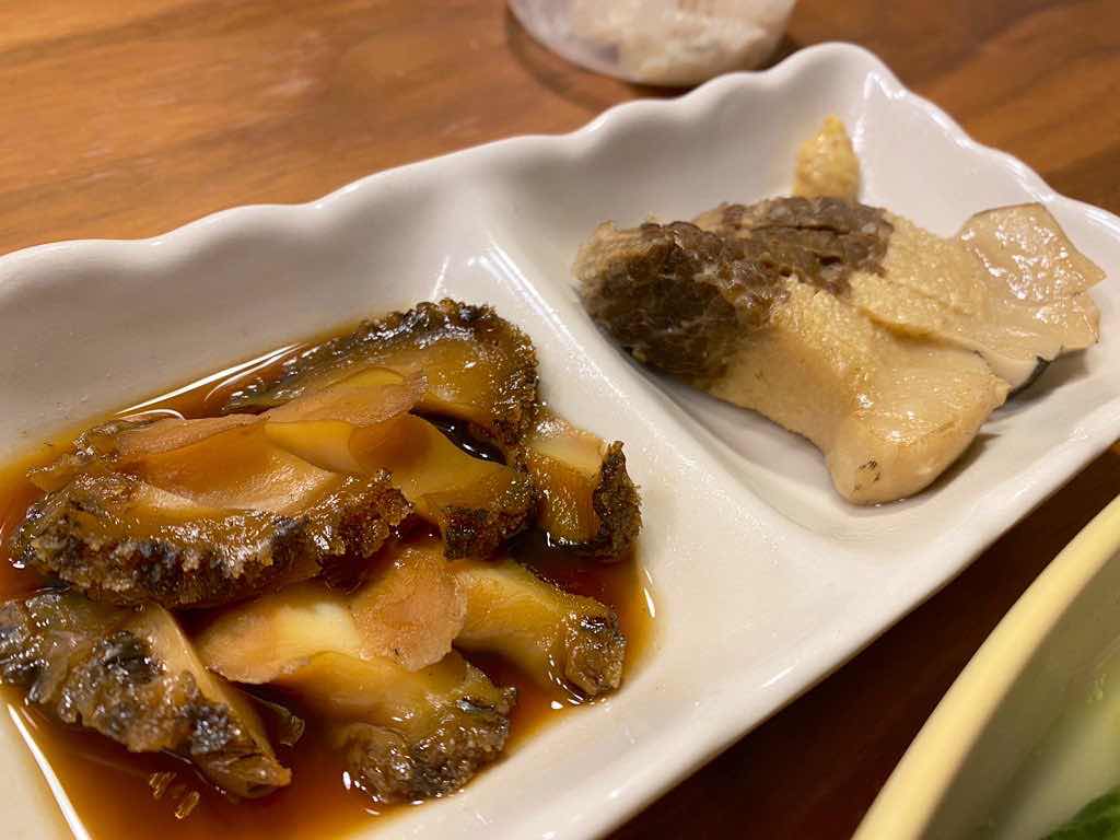 煮鮑と自家製畝須塩茹でをアテにしてました。