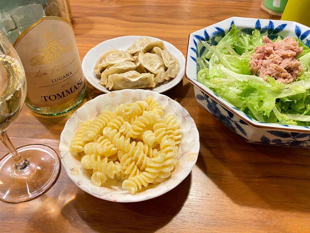 昨夜のチーズソースでフジッリも作り置きしていたので、今夜は温めて少し食べていました。