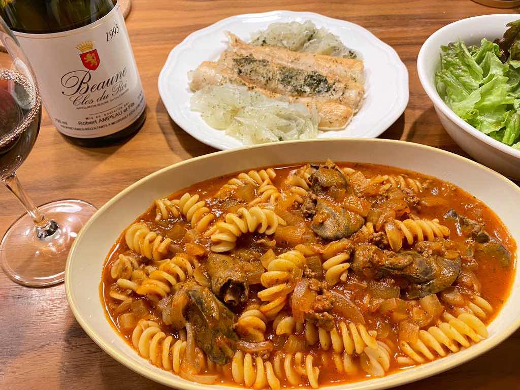 玉葱や賽の目に切った大根をタップリ入れて煮込んだトマトソースは胸焼けし難いと感じます。