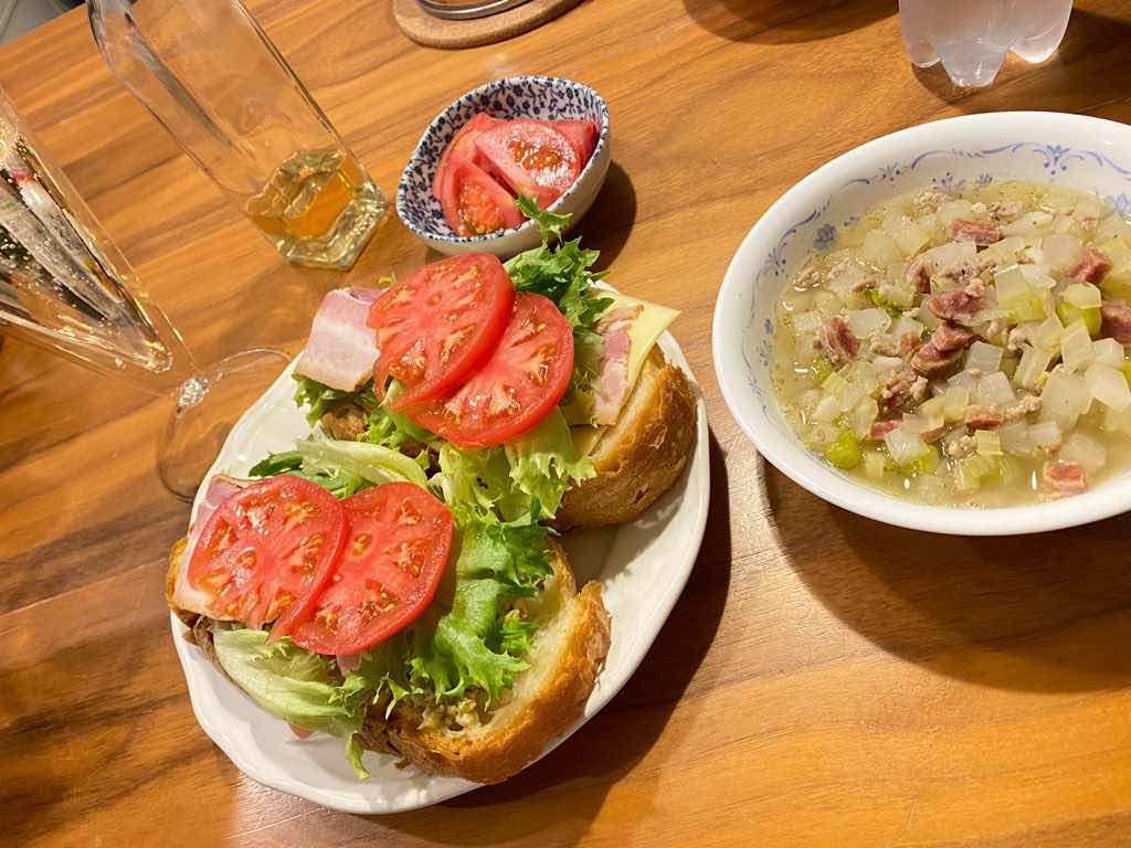大きなフランスパンに具材が多くのせたので、半分に折って食べるのが大変でした。