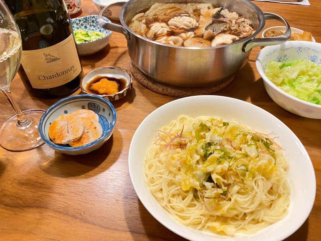 カッペリーニで簡単海鮮パスタ、あん肝と白子に鱈の鍋