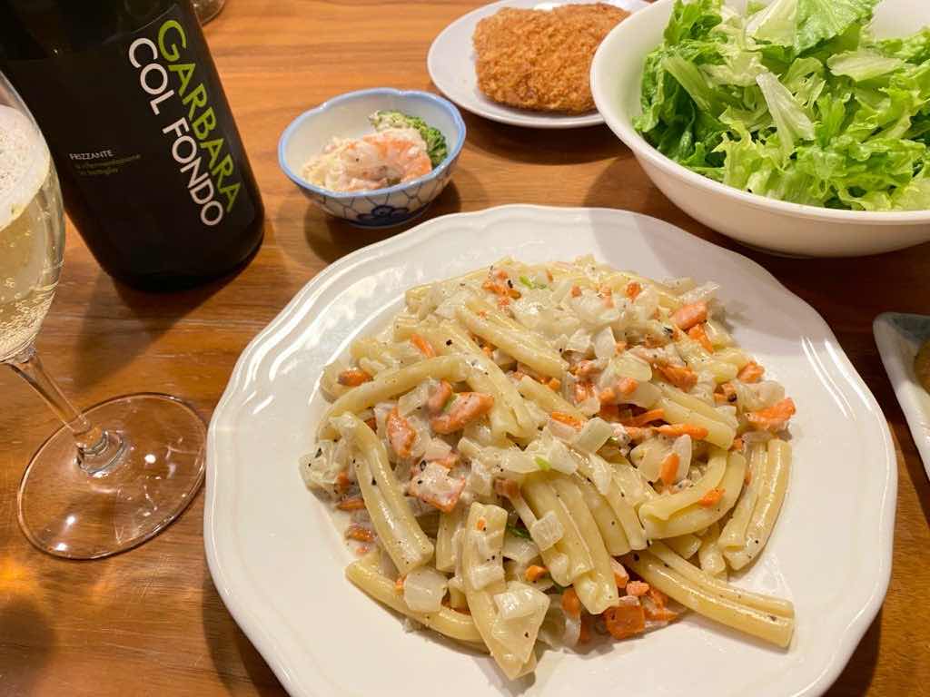今夜はサーモンのパスタに、ガルバラのフリツァンテ。