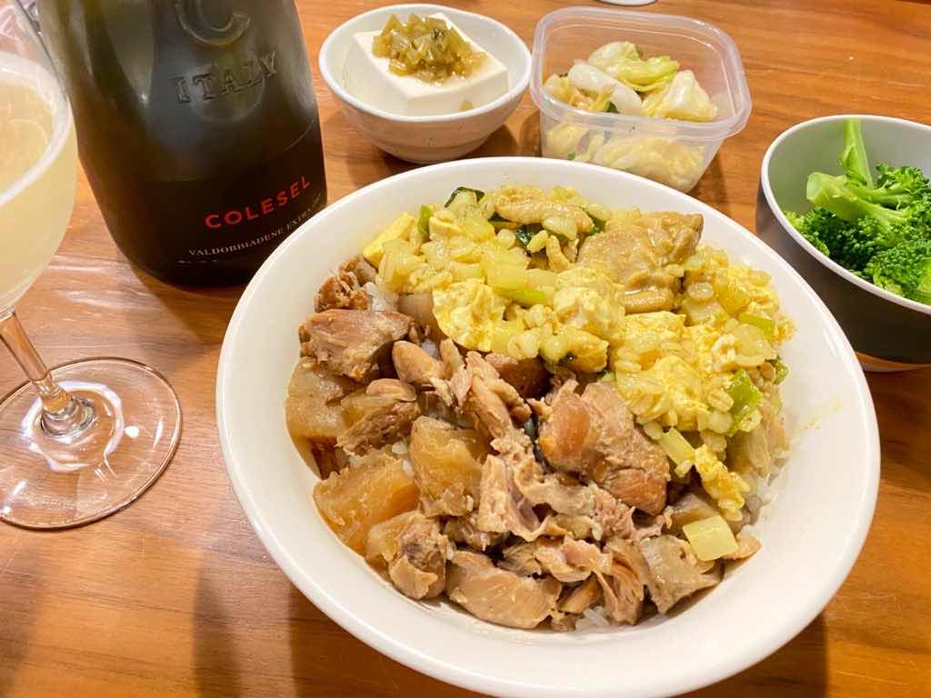 鶏の柔か煮とカレー風煮込みを丼ものに。
