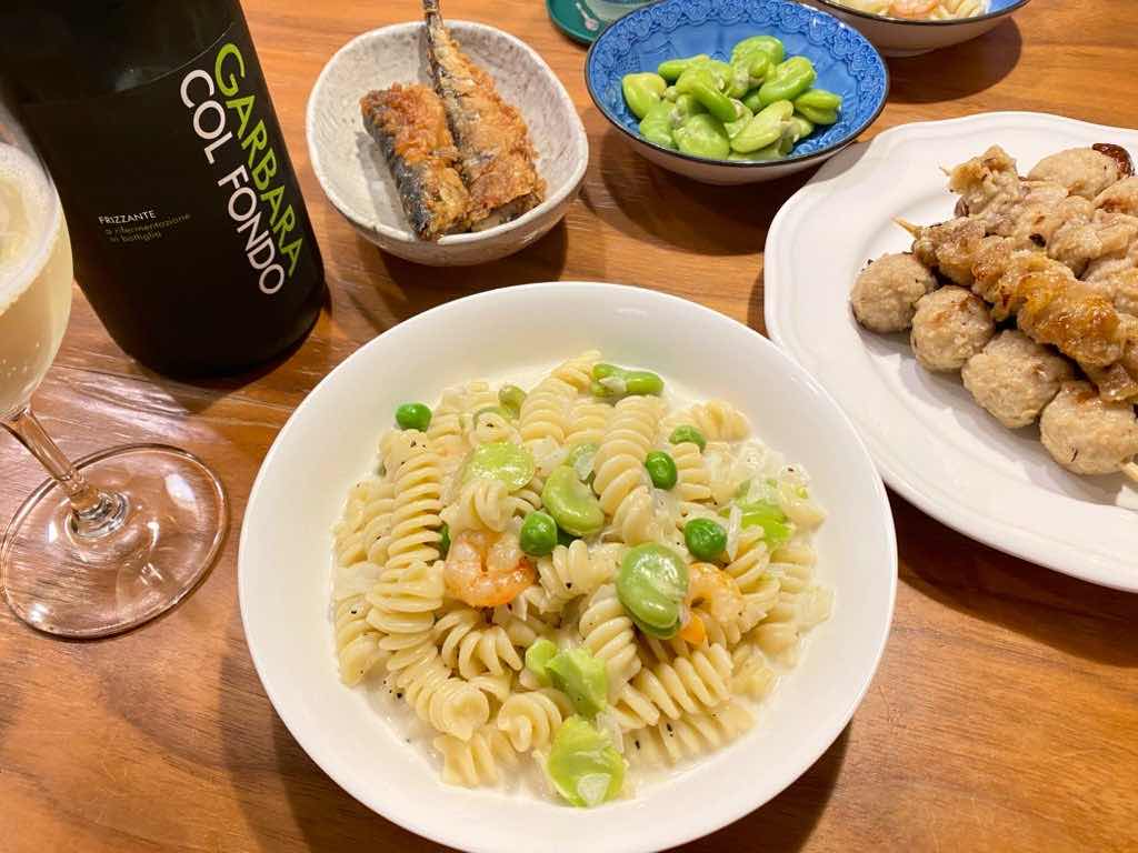 そら豆と海老のパスタ。
