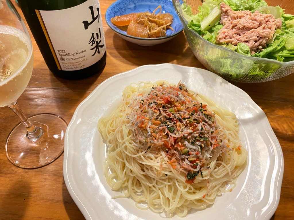 カッペリーニと梅入りシラスでパスタ。