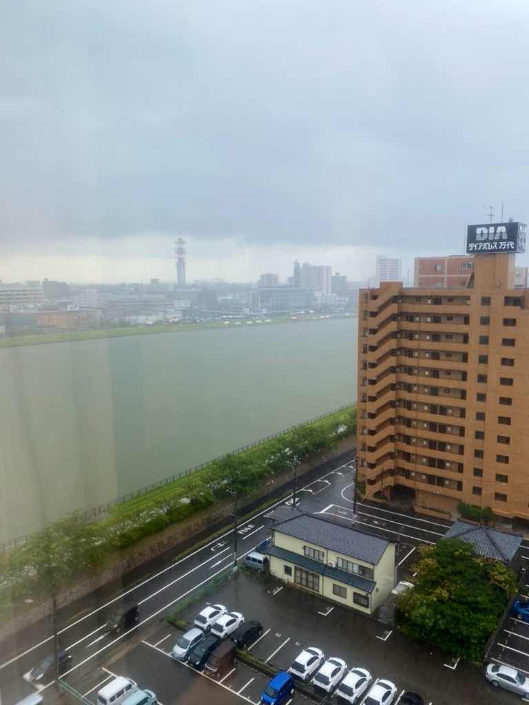 ホテルオークラ新潟さんで朝食中に外が騒がしい…窓の外は土砂降りでした。