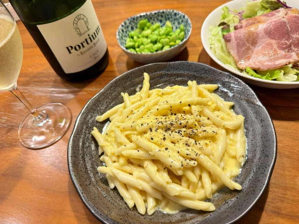 ストロッツァプレーティで卵入りのクリームパスタ。