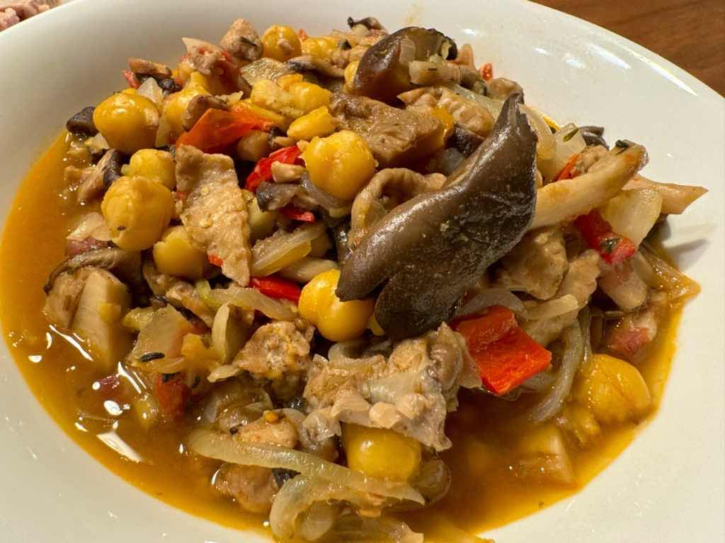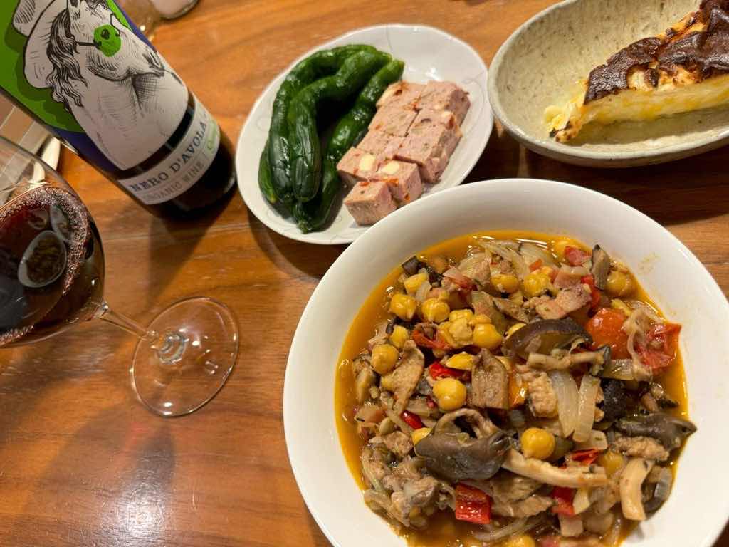 パンチェッタと豚肉に鶏皮の脂だけで炒めてから煮込みました。