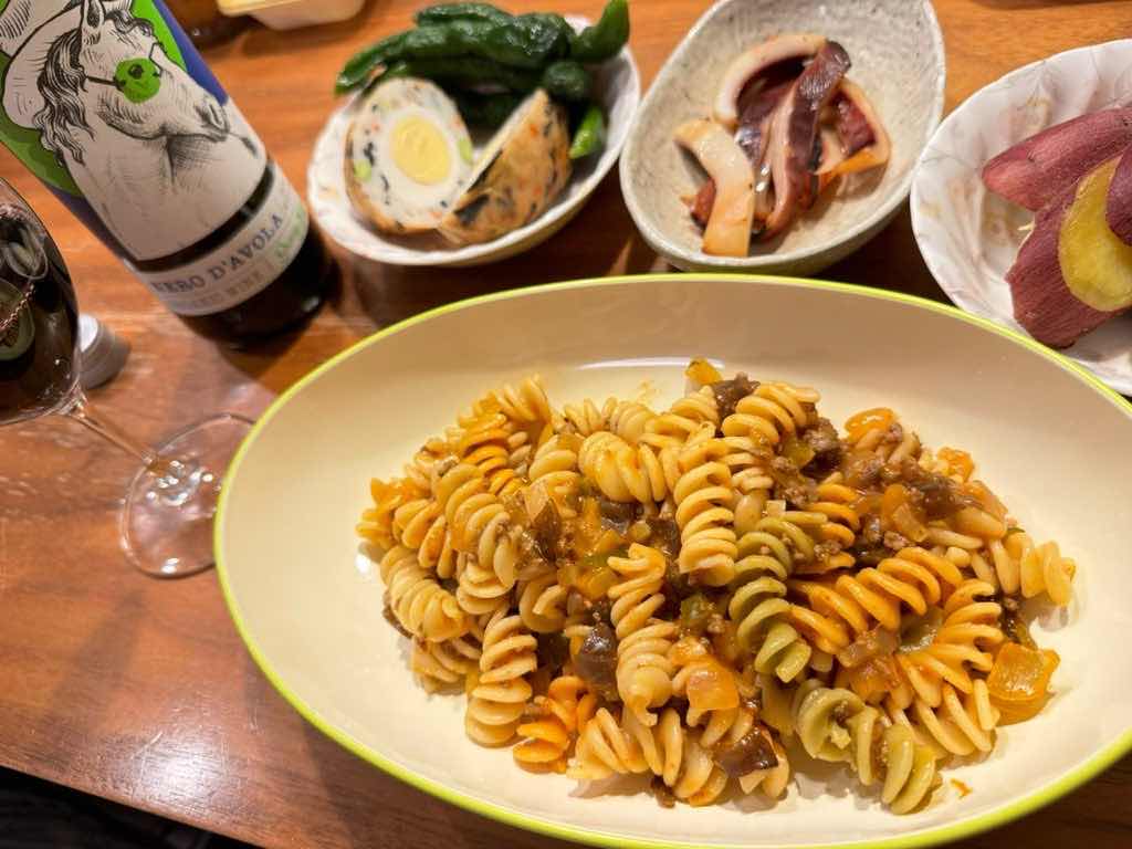フジッリをラグで煮込んだ煮込みパスタ。