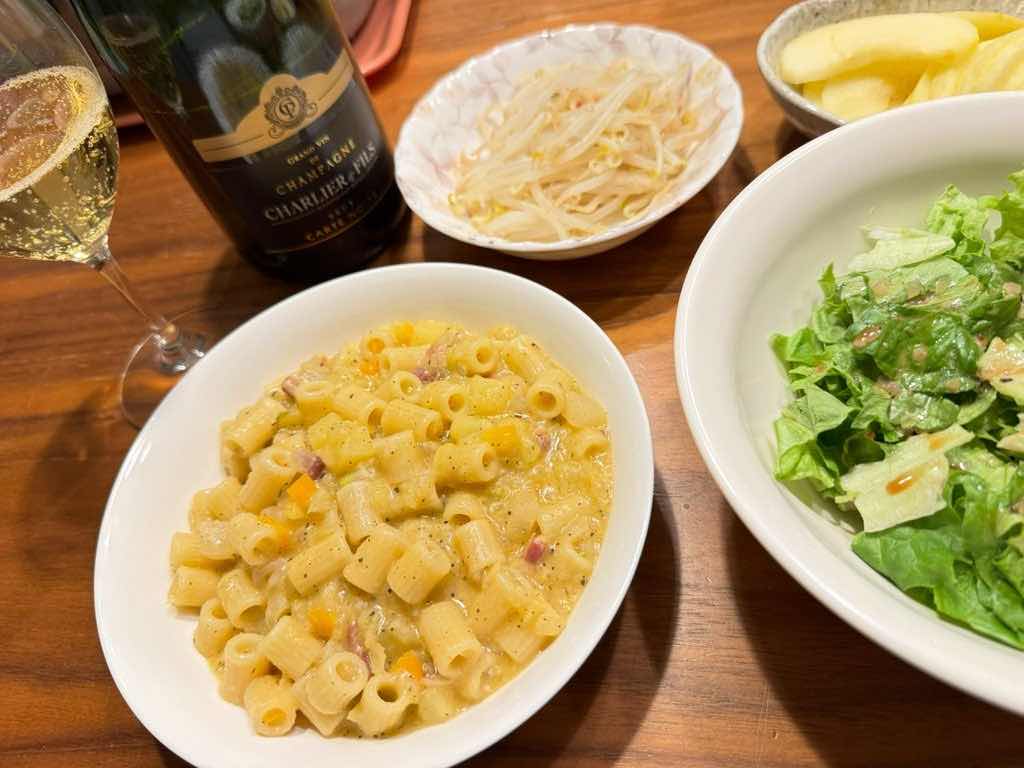 パンチェッタと野菜を刻んで煮込みながらパスタも煮込んでます。