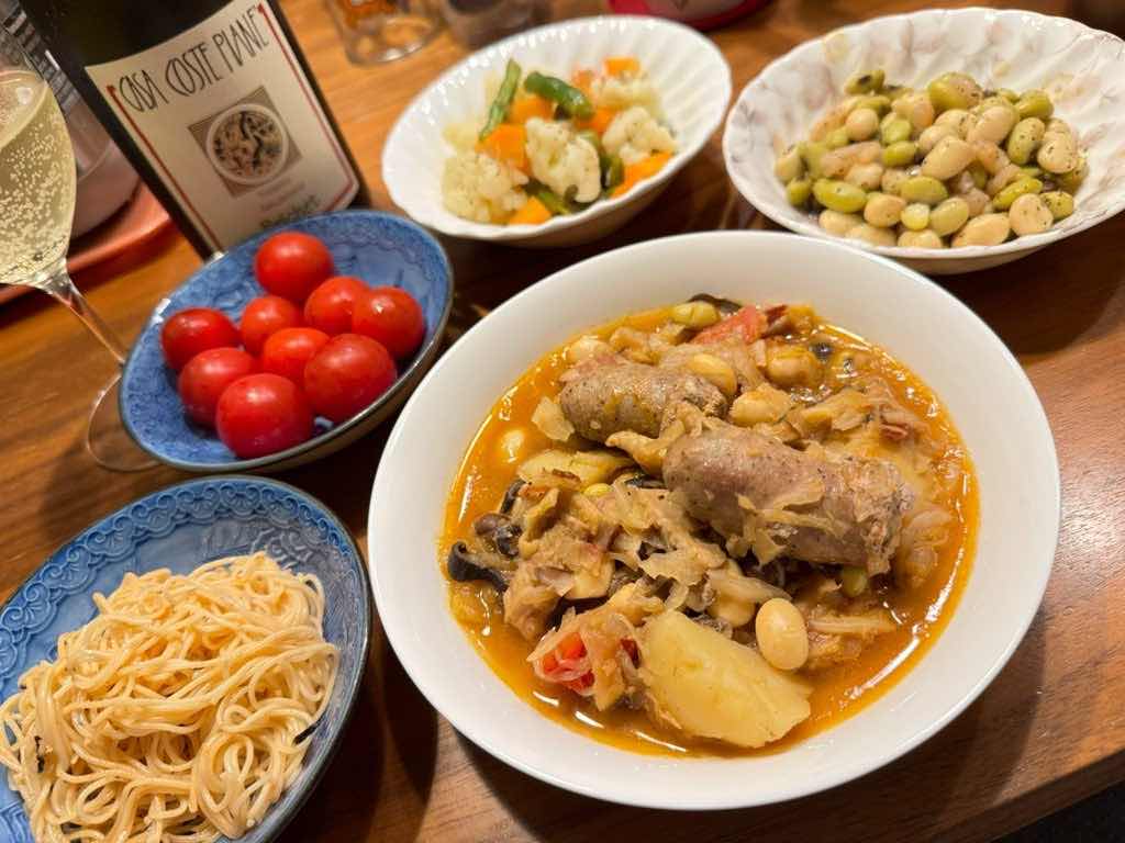 キャベツを大幅に足して煮込んでます。