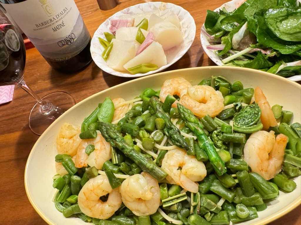 アスパラガスと海老のパスタ、蕪と骨付きハムの煮物