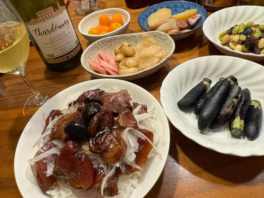 今年のラッキョウ漬けはシェリービネガー入りで色付いてます。