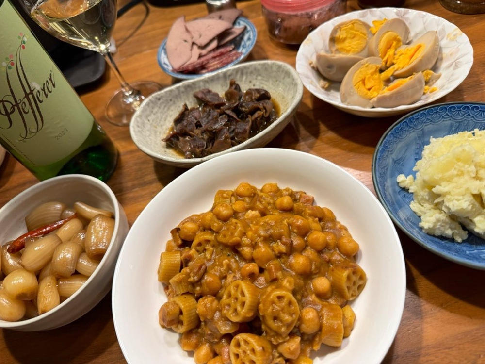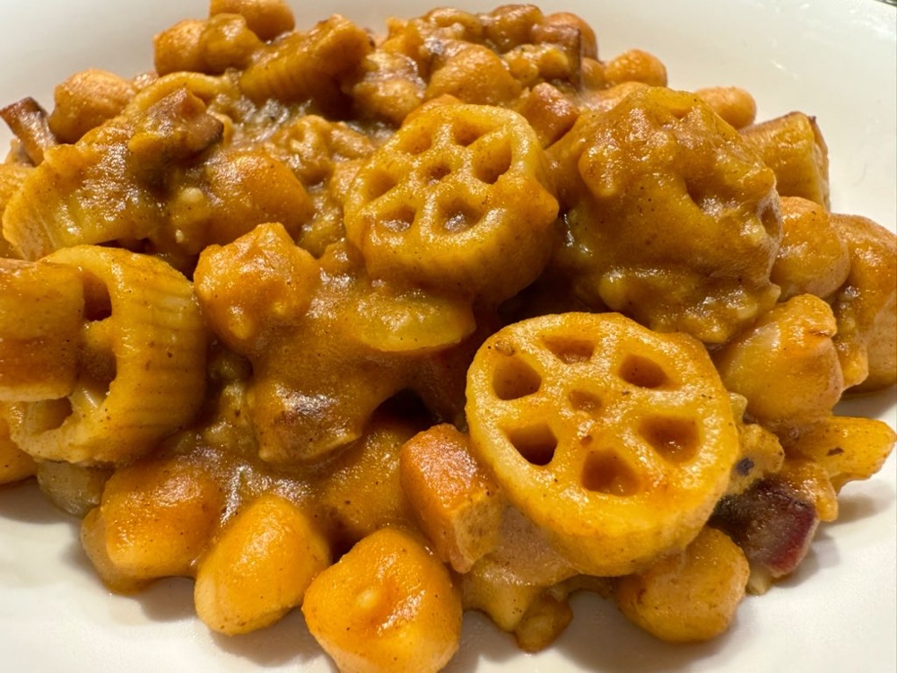 雛豆とジャガイモのパスタはカレー風味にしてパスタもホイールに。